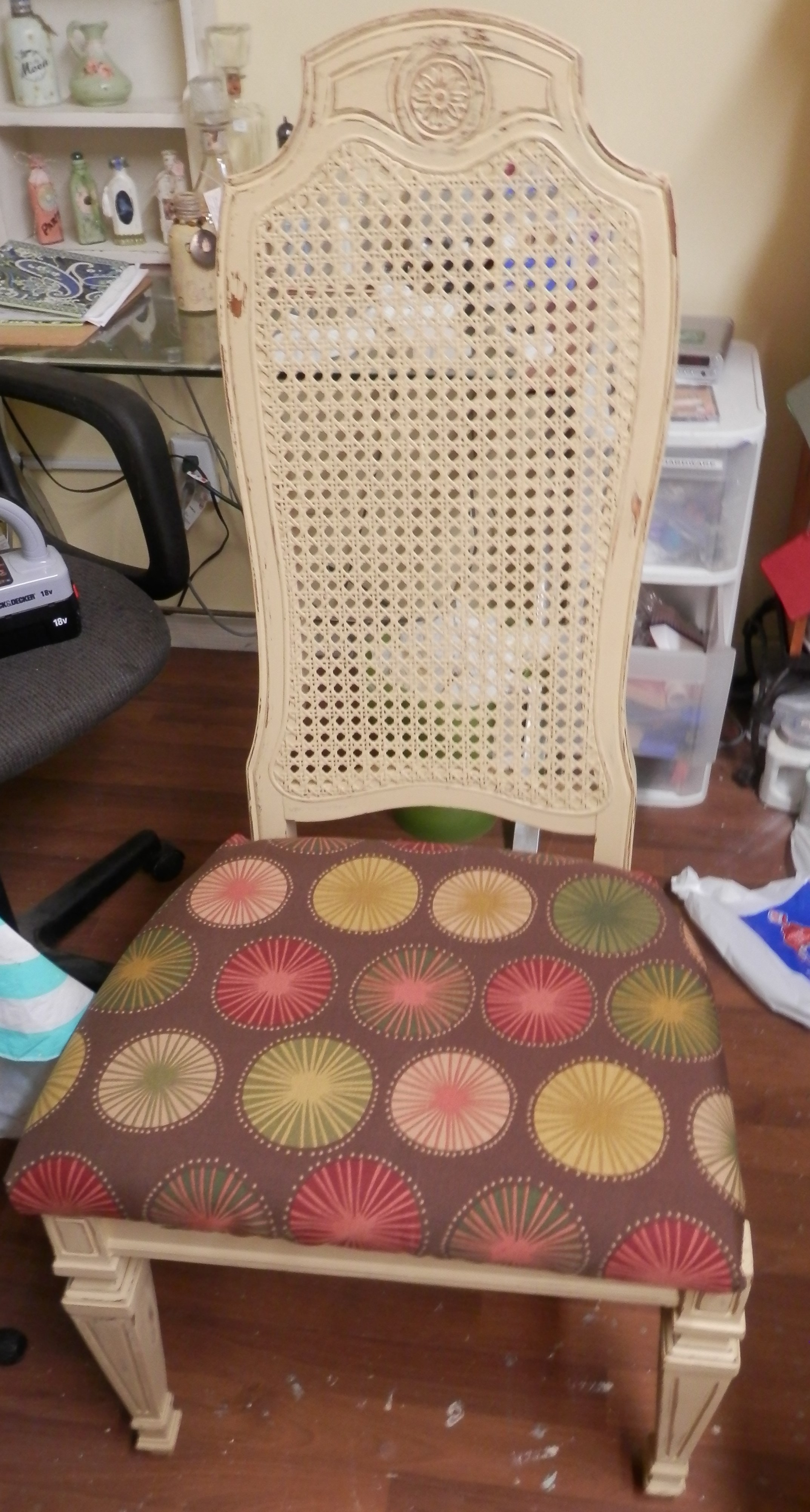 I purchased this table and 4 chairs at This That & More Flea Market. The designs on the top of the chairs and on the legs of both the chairs and the table were my favorite part when I bought them. However I was wishing for less grooves when I was doing the sanding because it was exhausting. But I do love the way they came out. The flower type fabric goes well with the flower design on the chair. I found the fabric at Joann’s and wasn’t sure I liked it till the whole project was complete. This set was in my shop for less than a week. My sister and her husband just moved to my hometown and decided to buy it for their kitchen/dining area. I’ll post what it looks like in her kitchen soon. I am so glad I get to still enjoy it when I go to my sister’s after putting so much work into it.