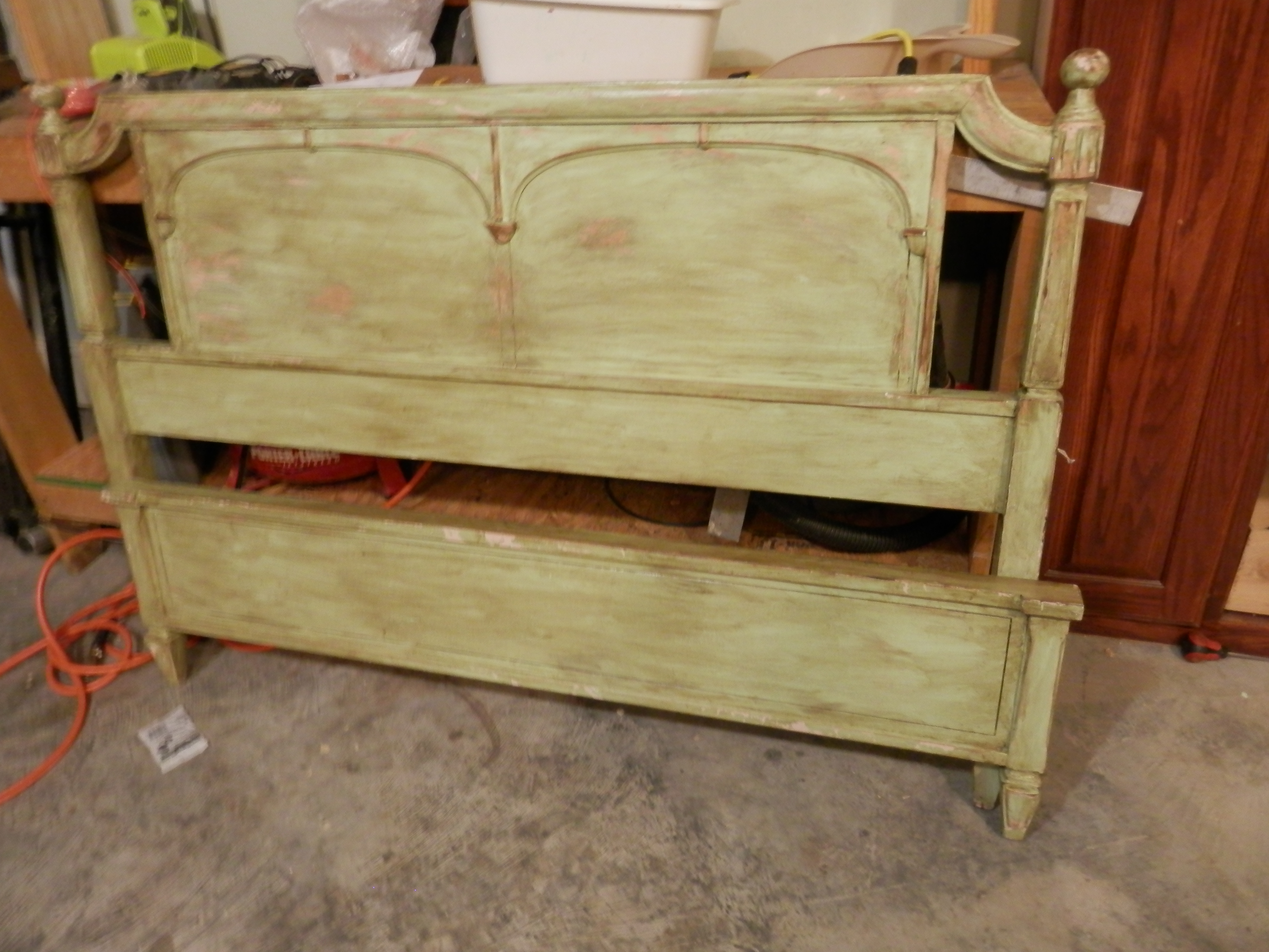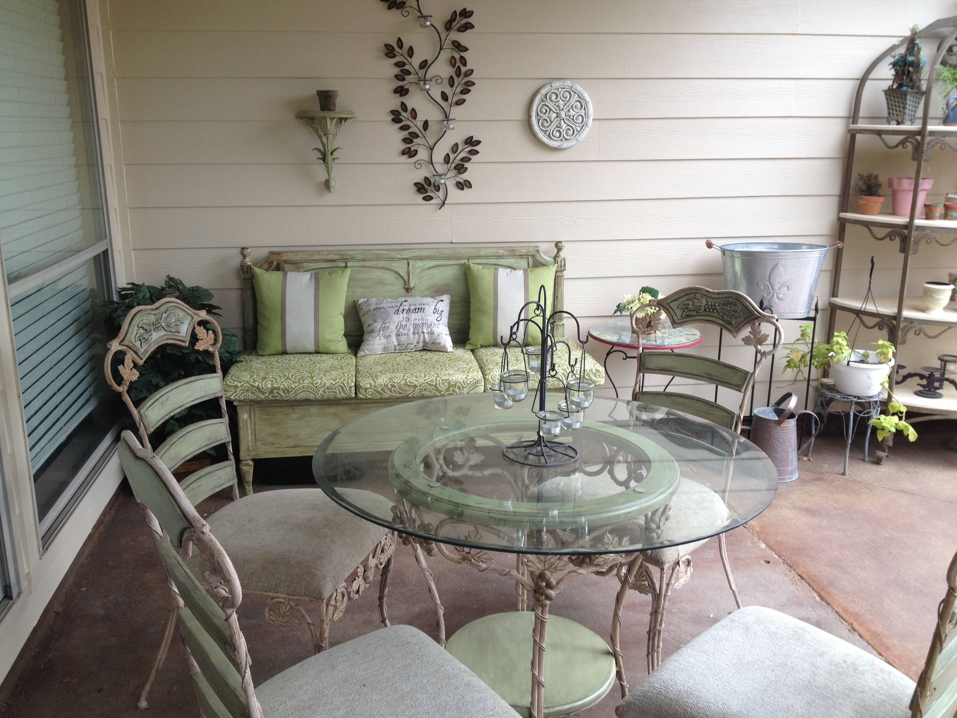 I painted, distressed and dark waxed a full size bed over a year ago for my daughter, who is a professional photographer, to use in a Christmas photo shoot. Recently she gave it back to me so that she could take the full size bed that I showed in a previous post. So my husband decided to take on another project and make the bed frame into a bench. This one he did a little different. He used the footboard in the front of the bench and made the sides for it. Since this footboard was so low to the ground he had to add to the legs to make it a better height for sitting. It seemed like it would be an easy project for me since it was already painted – all I had to do was refinish the new wood to match. It ended up a little bit more of a challenge because I put on the wrong finish – a black antique glaze instead of the brown dark wax which I had used before. I had to paint and wax the new wood twice but it all worked out. I found the perfect pillows and cushions to put on it at Lowes. Then the best part of the whole project was when I realized this bench would have a perfect home – Our patio! It matched perfect with the table and chairs that I had refinished a year ago.