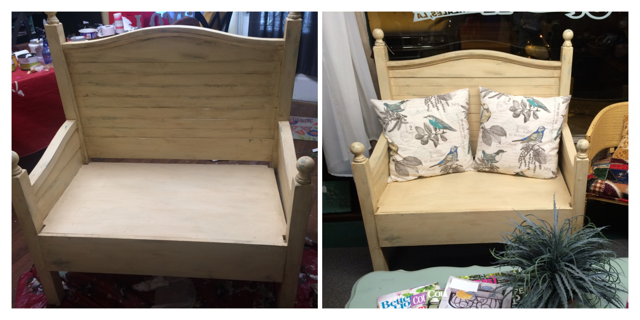 This is the bench in my shop with the pillows. The cushion will be ready soon. I love the bird fabric on the pillows and it really brings out the blue color in the bench. Thanks to my husband and sister for their help with this project.