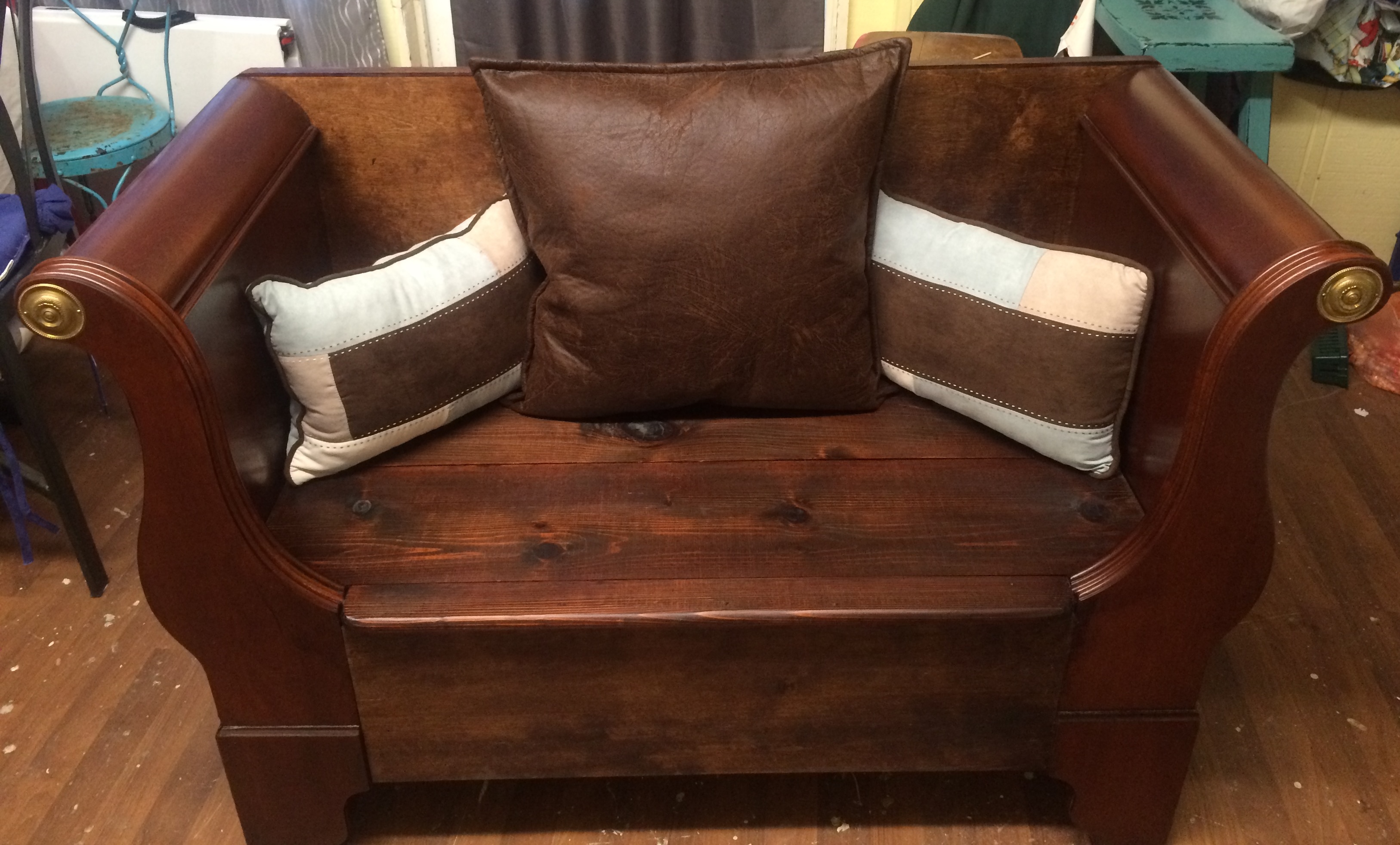Here is another bench made from a twin bed. The foot board was cut in half and used as the sides. The headboard is used for the back. This frame didn’t have any rails with it but was in very good shape and very sturdy. The only part that had some damage was 2 small areas around the knobs which I fixed with some wood putty. I also had to cover the metal screws with wood putty. Usually we redo old pieces of furniture; this was probably the newest piece we have done.