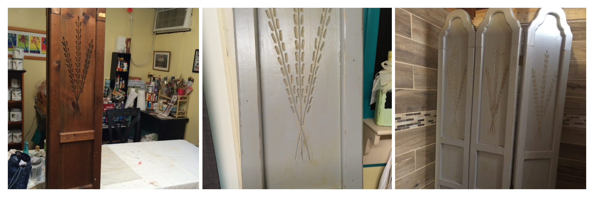My husband and I found this nice metal wall hanging at an estate sale. I have been looking for something to put on my kitchen wall ever since we repainted it. I love the designs on it but it was in need of some TLC. It was rusting and pieces were flaking off both on the front and back. First I scraped off all the areas that had loose pieces and sanded it lightly. Then I painted it Sherwin Williams Empire Gold – made into chalk paint. This is the same color as my dining room which is close to where I will have this in my house. I only had to paint one coat because I really wanted the original black to show from underneath. Then I distressed it which is very easy to do on metal pieces. Then I put on clear wax, let it dry and then antiqued it with dark wax. This was one of the easiest projects I have done in a long time.