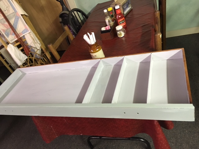 I took out the old felt lining and replaced it with some new gray felt.  My husband had to make a new piece under one of  the drawers for it to slide in and out on.
