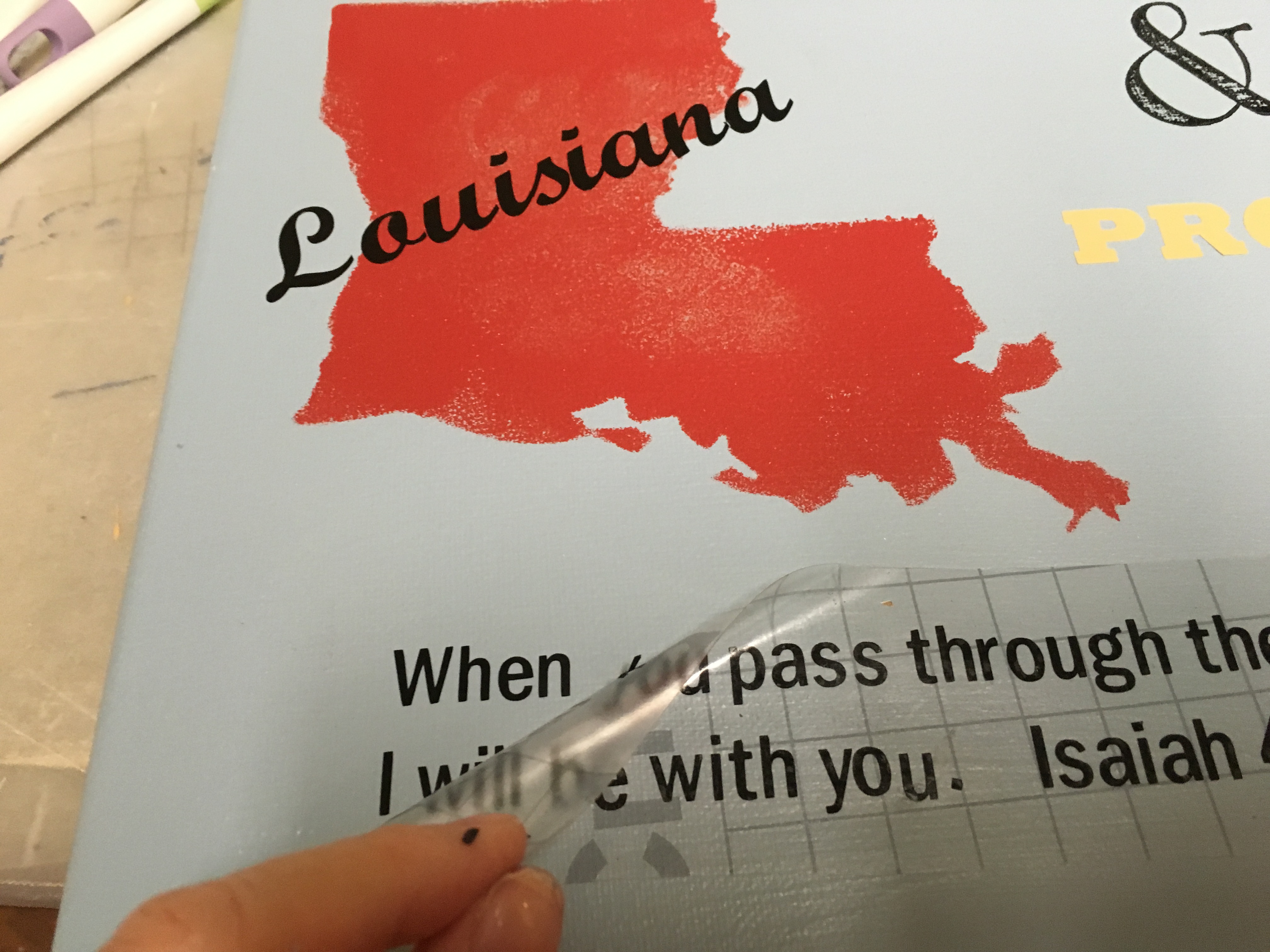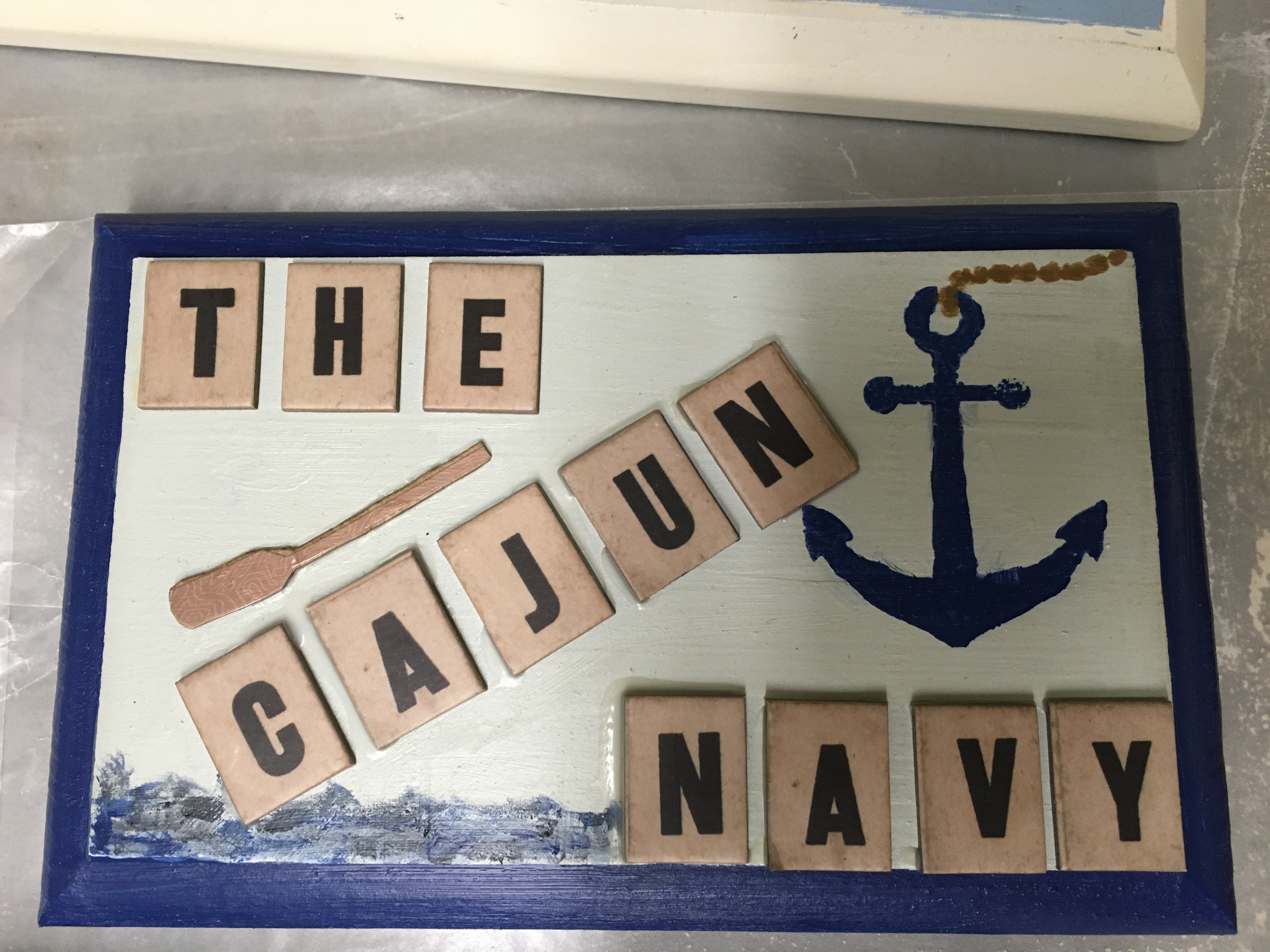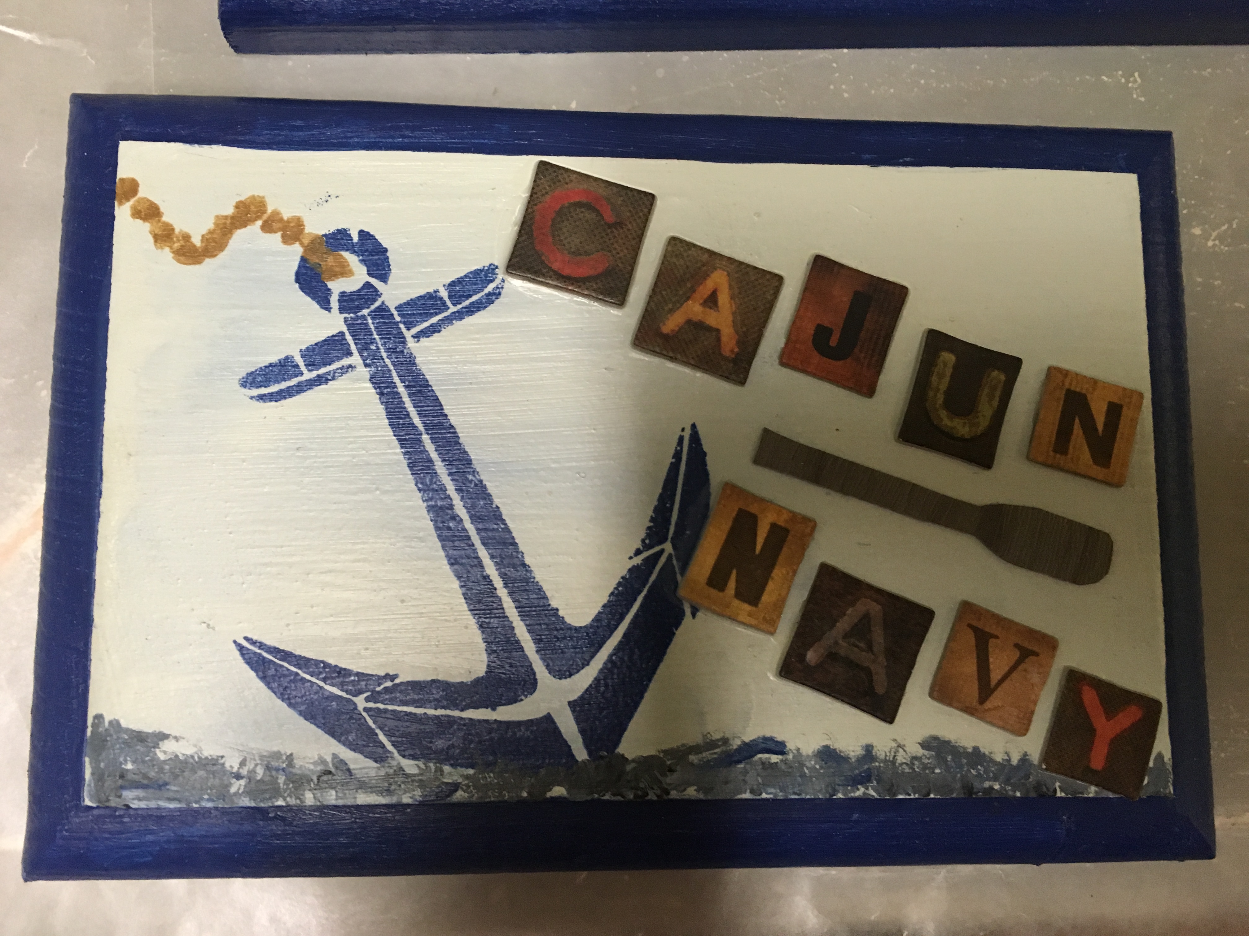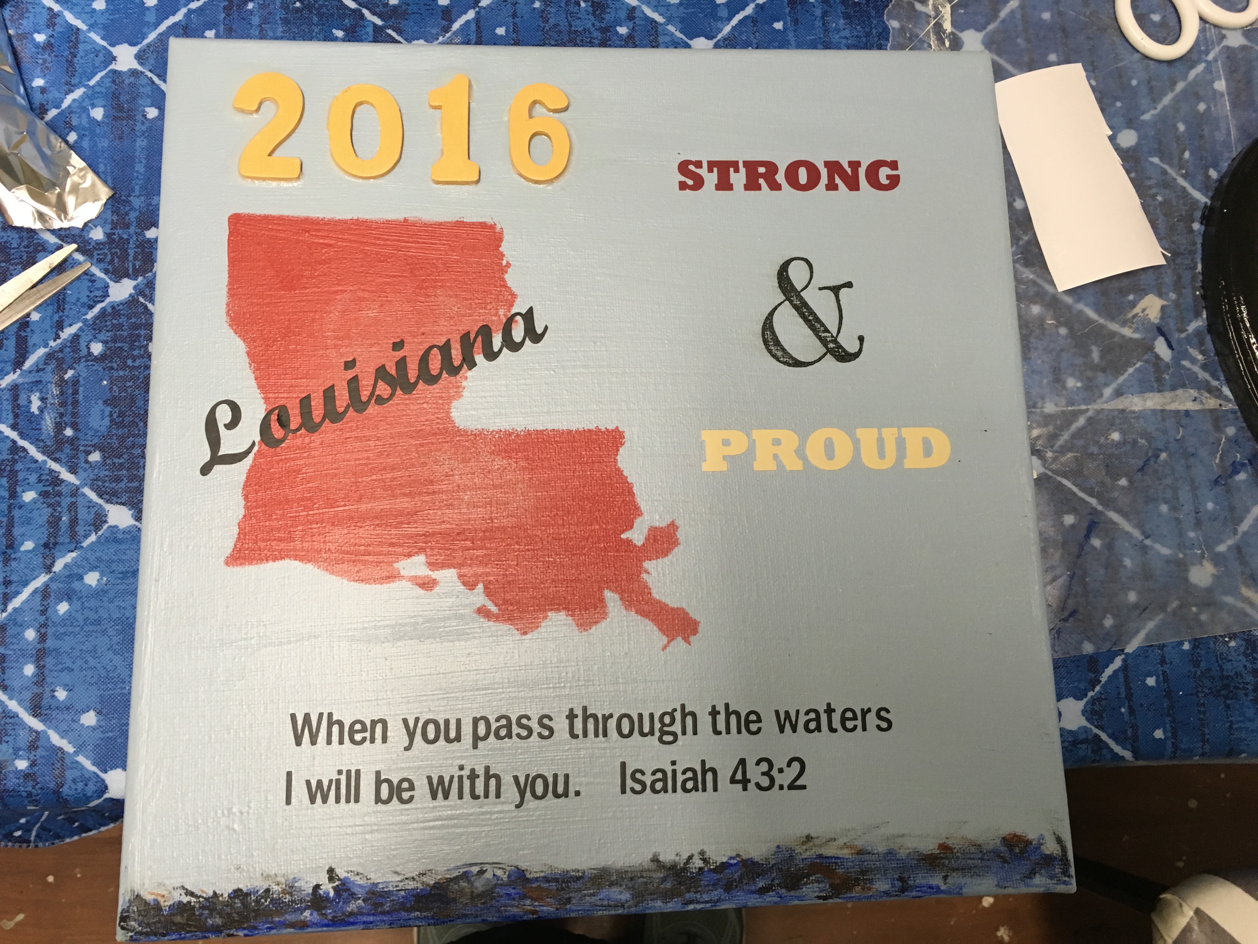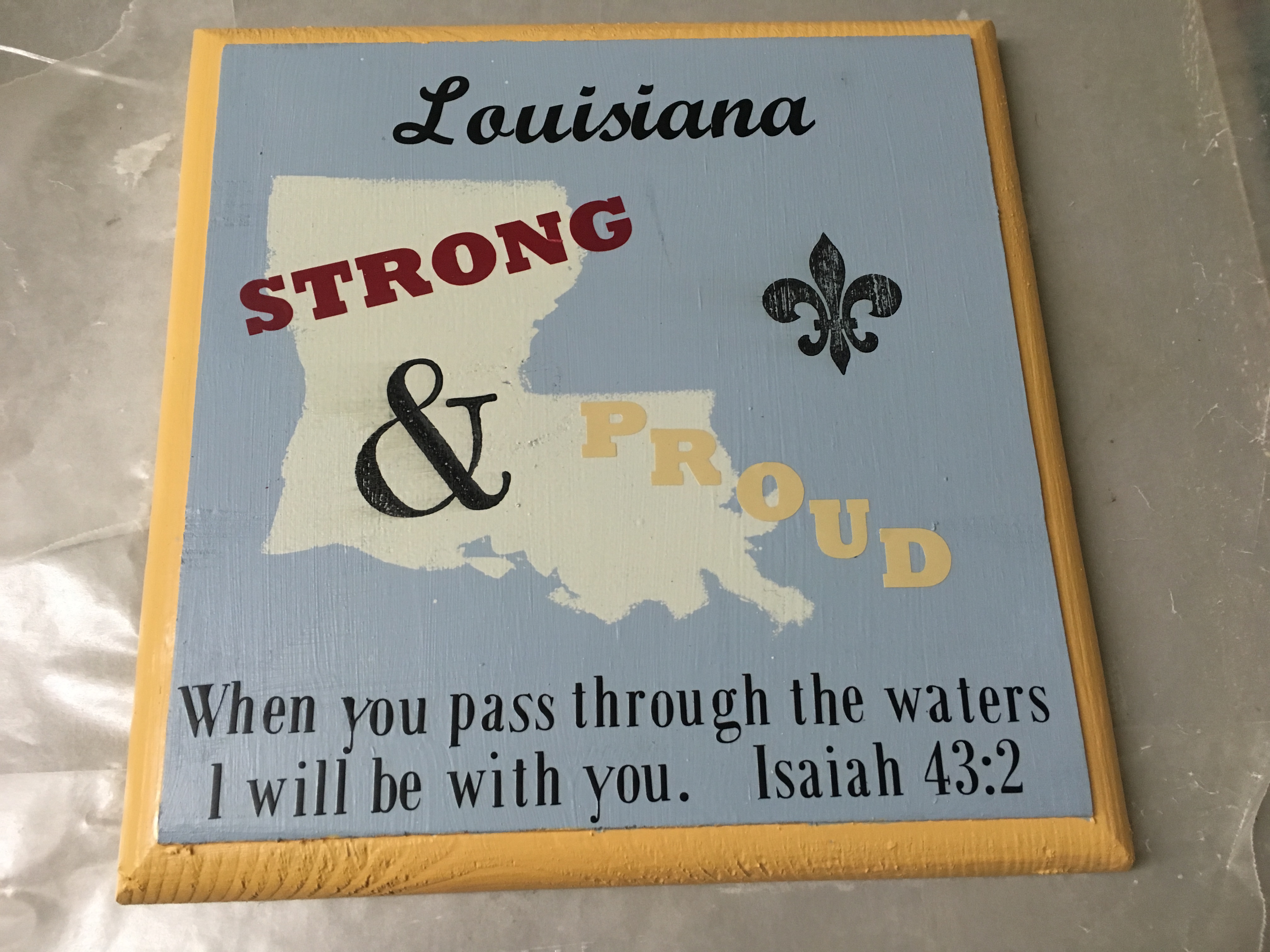 My workshop where I do my crafting was loaded with stuff of my daughters. It was all disorganized thrown in whatever could hold stuff, mostly garbage bags.  So when I finally got it packed in storage containers and moved to other areas of storage I had to do some crafting. Crafting is my STRESS RELIEF and boy did I need it!  The idea of making some plaques about Louisiana and what we were going through had come to me during the 2nd week of it when I saw sayings all over media and facebook about Louisiana Strong.  I ordered some Louisiana stencils on Amazon.  About the 3rd week of recovery I was able to take a break and do some crafting and it was a comforting, release of stress.