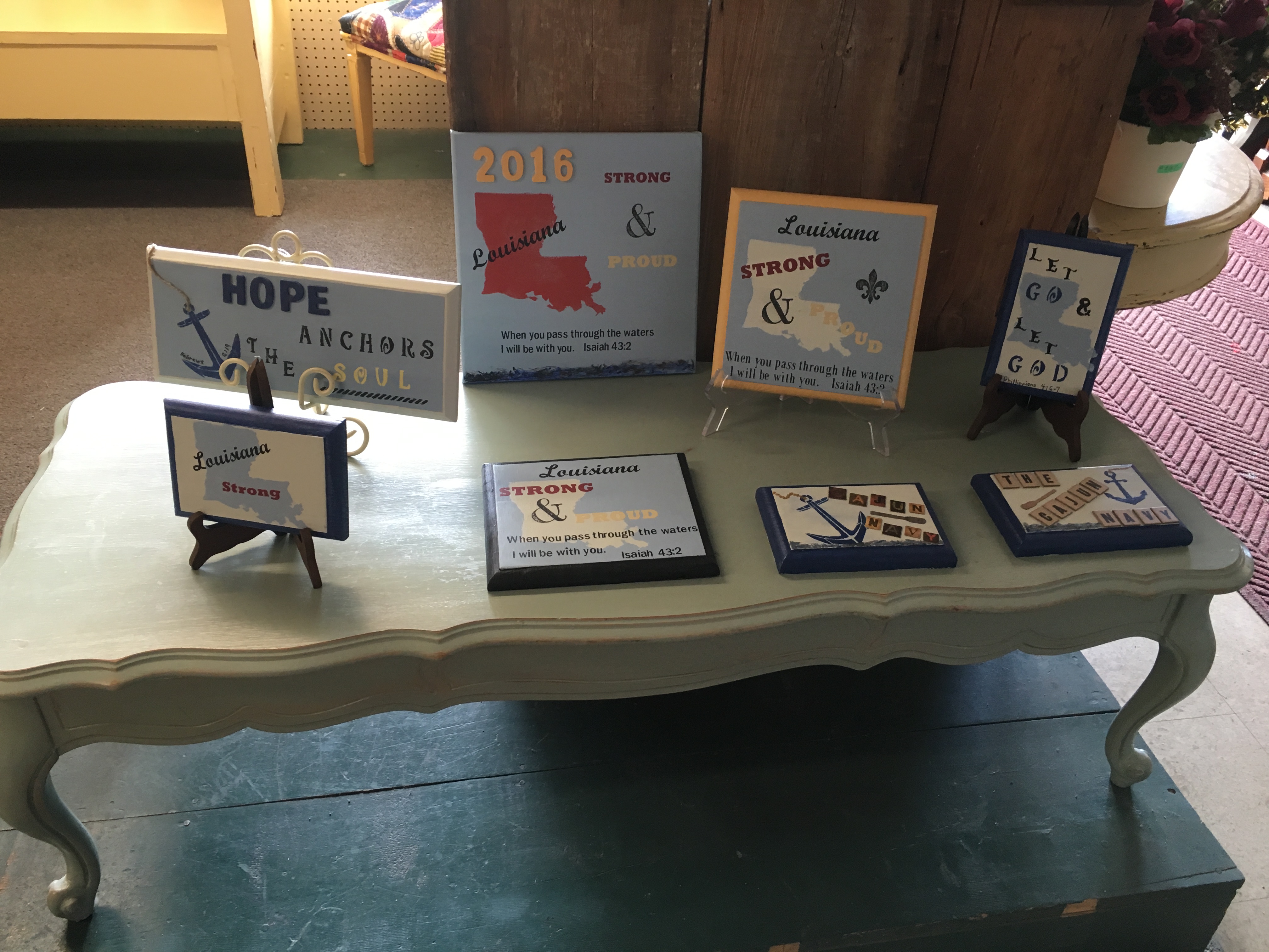 img_2019It’s been a long time since I posted a blog on my website because here in Louisiana we experienced a devastating flood in August called “The Great Flood of 2016”.  It has affected everyone in our area whether their house flooded or not.  Two-thirds of our parish’s population ( 30,000 to 40,000 homes ) were impacted by historic floodwater. Nearly 800 businesses were affected.  Thank God, our businesses – “Country Kitchen” and “Ginger’s Attic” were not flooded. It was very close; the water was up to the top of the “New River” that runs in front of our business by the railroad tracks and some houses two blocks away on each side got water.   We are very blessed!  We were able to open on most of the days even when the flooding was happening around our area so that we could get food out to people.  Some meals were delivered and some of the area workers and rescue workers such as “The Cajun Navy” came out and we gave out many free meals that first week.  We have also been giving out free meal coupons to those affected by the flood to come get a good home style cooked meal. Sometimes people need a boost and comfort food will help.  When people check out at our restaurant we hear stories of the problems people are facing. It is heartbreaking! Since this flood was unexpected and historical many people who flooded were not in flood zones and didn’t have flood insurance.  People have had to throw out all or part of their belongings onto the street and then watch trucks come by and pick up things they have accumulated during their lifetime. Many are having to have their home bulldozed.  It is especially hard on the elderly. How do they start over at this time in their lives?   Our family was personally affected by this event with our two daughter’s houses flooding and our rent house where my sister and brother-in-law live.  It has been a whirlwind of packing, gutting, cleaning, insurance and FEMA  issues, and hard, hard decisions that have to be made, especially with my daughters.  We had family living with us and they brought along an animal family of 10 guinea pigs, 3  dogs, and a cat!    I personally feel like I have moved 3 times in the last month with all the packing  sorting, discarding, and storing of 3 households of stuff.  I didn’t do much gutting in houses – we had help doing that.   We are so blessed with many people that have come forward to help – friends, family members, church members, golf buddies, groups from other areas, donations from people – even strangers!  Louisiana is very proud of the way we have come together to get through this strategy and we are relying on God to continue to guide us and get us through it.