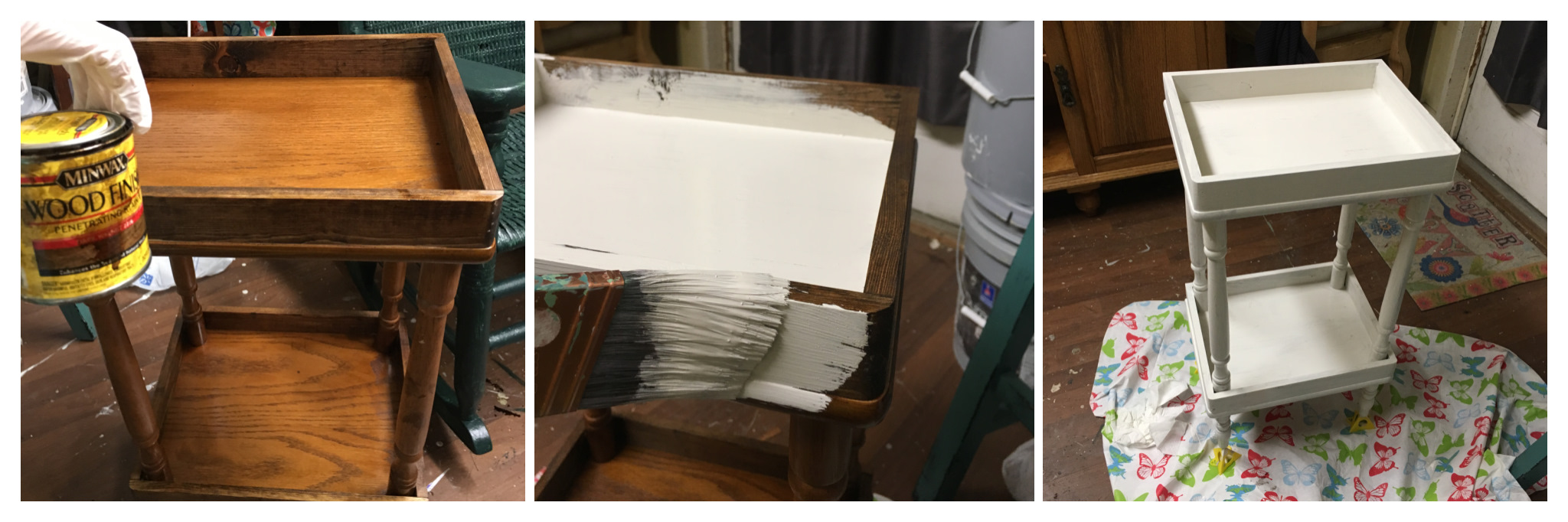 The first step was to take off all of the hardware and the bottom cabinet doors and to take out the 2 long drawers. My husband lifted the top part of the cabinet off and put on a table so it would be easier to reach and paint.