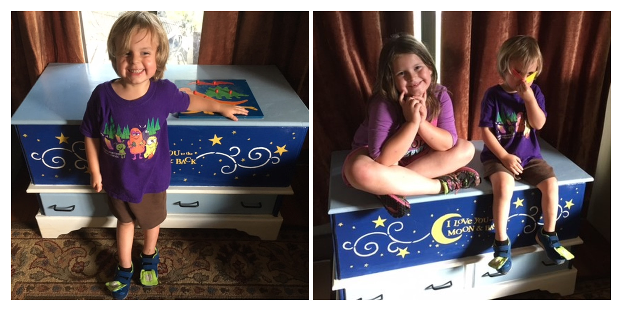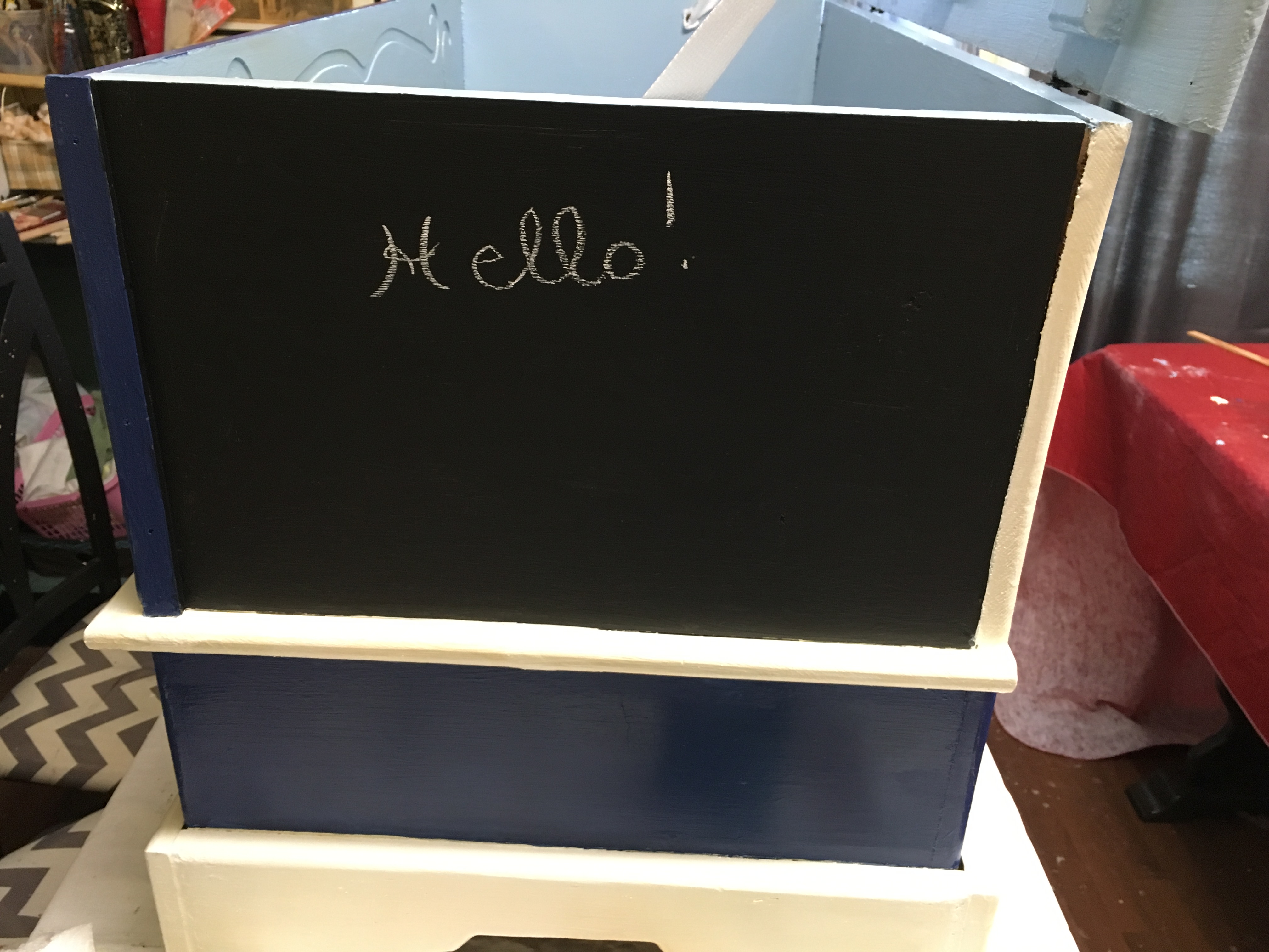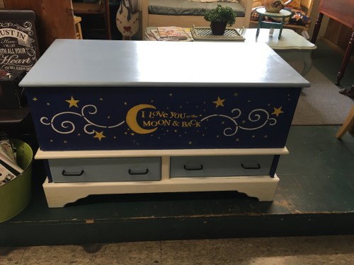 First I painted the entire piece Sherwin Williams Dover White, then painted the top, inside, and drawers light blue, the front panel and a strip around the side and back Sherwin Williams Indigo. I also painted black chalkboard paint on two small areas on each side. I used stencils for the saying and designs on the front panel. My husband attached a strap to each side of the top to keep the top from flipping all the way back. I put new hardware on the drawers which I think really made a big difference. I decided not to distress it . (I’m sure my grandkids will add that effect to it with time). I put Polycrylic on the whole piece except for the two small areas that had chalkboard paint so it can be used as an actual chalkboard. I think my grandkids will enjoy it and I sure do love them to the Moon and Back just as the toy box says! Update: Sad to say that this had to be thrown out after the flood of 2016 in Louisiana