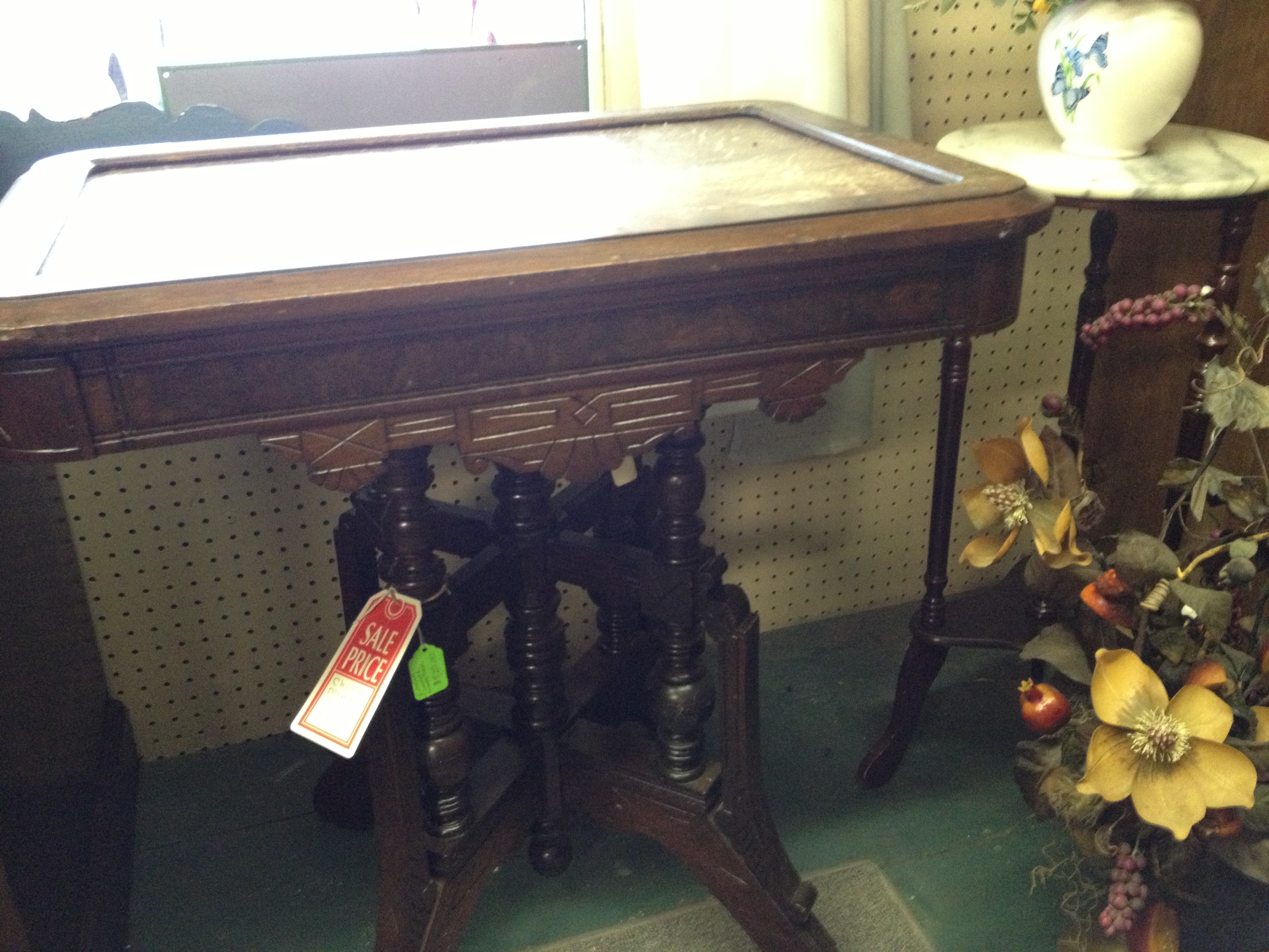 End table with 4 drawers- painted green & distressed, top gel stained. The drawers easily glide open and shut. It is a very sturdy piece of furniture. Price $150